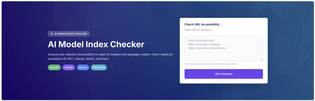 The AI Model Index Checker validates that your site is physically accessible to LLM crawlers like GPTBot and ClaudeBot. It identifies hidden server blocks or robots.txt directives that prevent these bots from retrieving and indexing your content for AI-generated answers and citations.