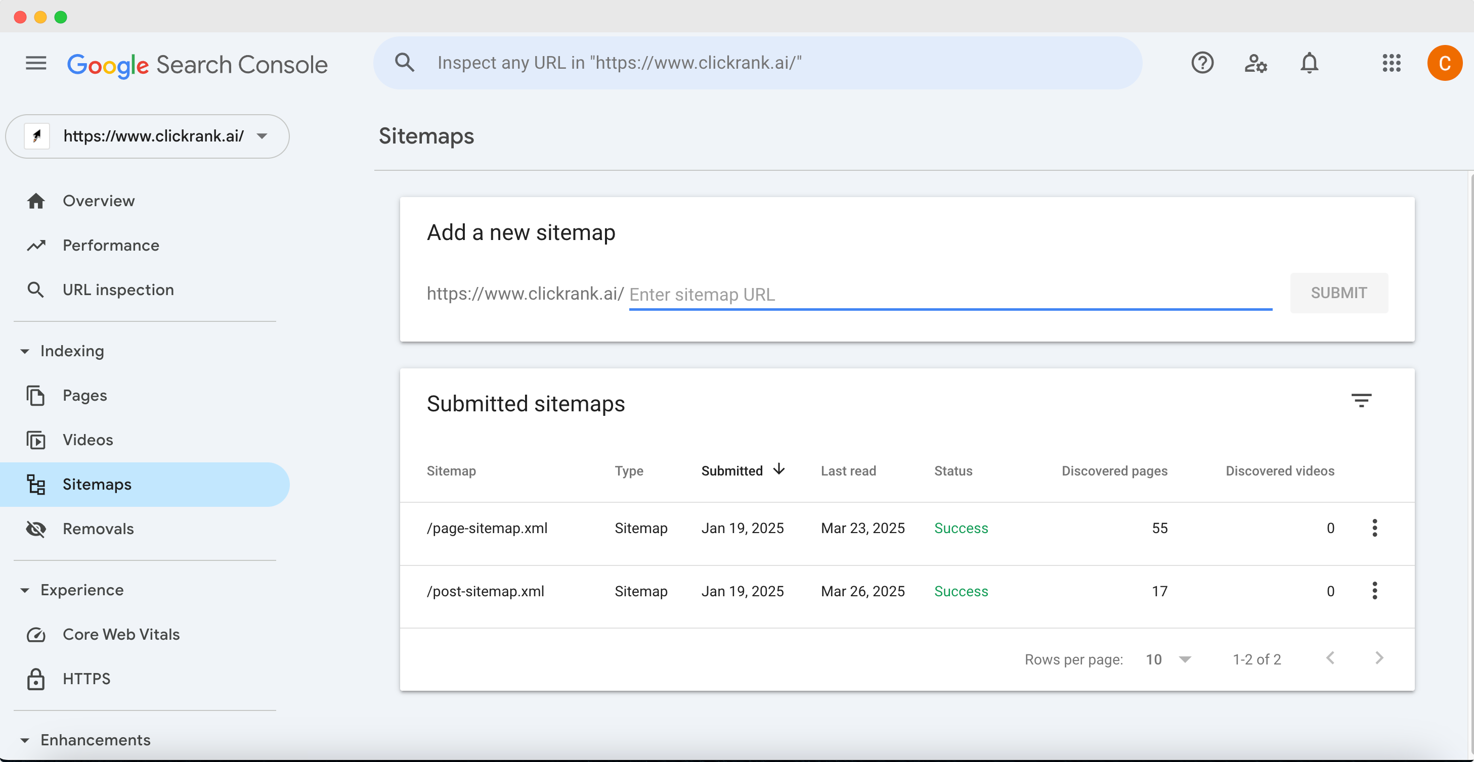 yourwebsite.com/sitemap.xml. If you’re not sure, try typing/sitemap.xmlafter your homepage URL to see if it loads. If you don’t have a sitemap, you can use online sitemap generators or plugins to create one. - In Google Search Console, navigate to the “Indexing” section in the left menu and click on “Sitemaps.” This will open the sitemap submission page.